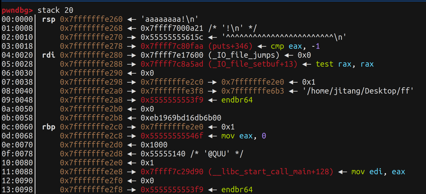 先计算字符串的偏移,一般canary的后两位是00,算出canary的偏移在17,下一个程序在后两个,第19